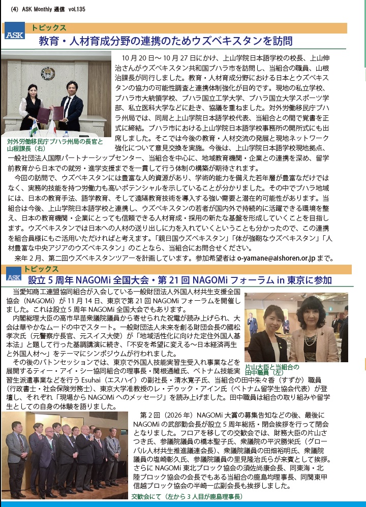 トピックス「ウズベキスタン訪問」「NAGOMi全国大会・NAGOMiフォーラムin東京に参加」