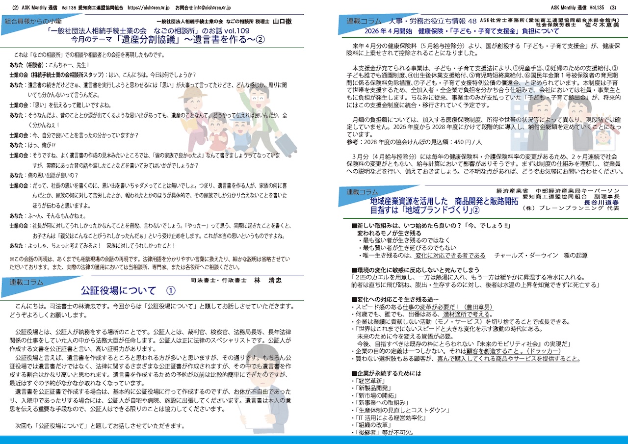 連載コラム 「なごの相談所」遺産分割協議〜遺言書を作る〜②、公証役場について ①、人事・労務お役立ち情報48 子育て支援金負担について、地域産業資源を活用した商品開発と販路開拓 目指すは「地域ブランドづくり」②