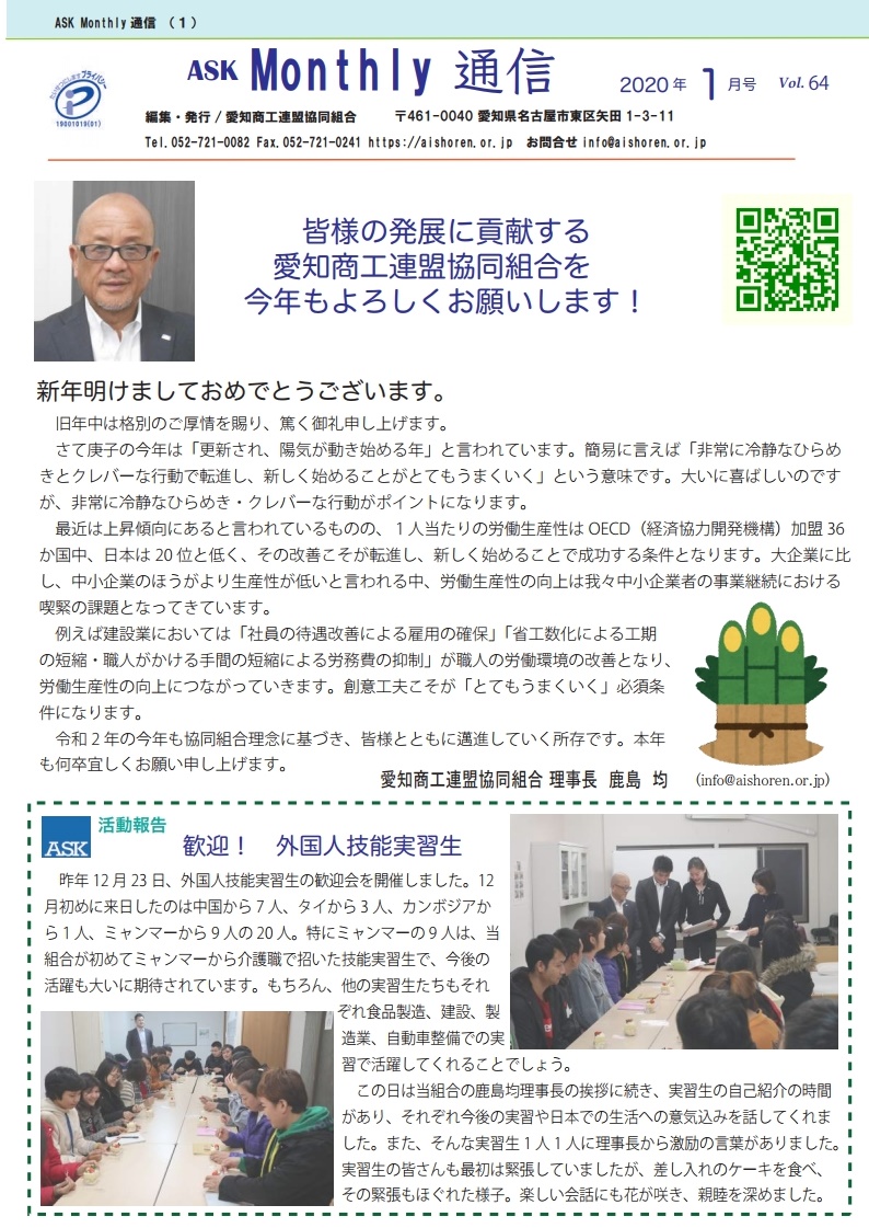明けましておめでとうございます。本年最初の広報誌です。今年もよろしくお願いします。 今号は、東京に本社のある人材会社や、新顧問の方をご紹介。 昨年末に来日した外国人技能実習生の記事もあります。 主な内容 組合員様ご紹介 株式会社カラーズ 様 お知らせ 新顧問紹介 活動報告 外国人技能実習生歓迎会を開催 連載コラム 「なごの相談所」相続って、押し付け?、相続法改正についてその4、なぜ働き方改革なのか その他